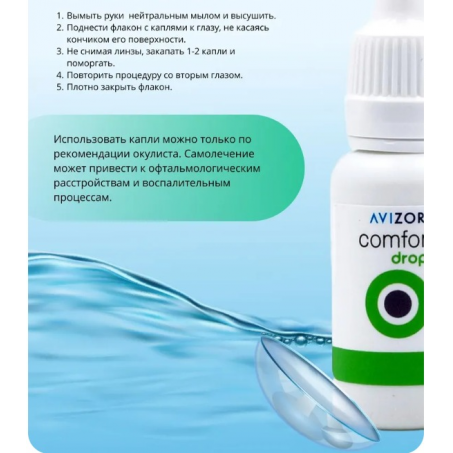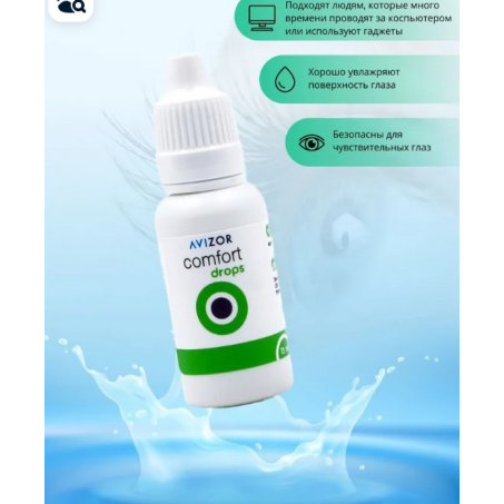 Увлажняющие и смазывающие капли Avizor Comfort для мягких контактных линз. Эти капли близки по составу к слезной жидкости и являются незаменимым средством для тех людей, кто большую часть времени проводит в душном помещении за работой на компьютере. Comfort Drops идеально успокаивают глаза, снимают раздражение, покраснение, устраняют сухость.